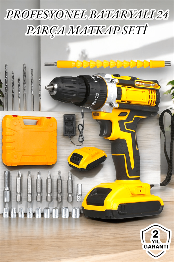 24 Parça Çift Bataryalı Şarjlı Matkap Seti 24W Motor ve Otomatik Mil Kilitli Tasarım