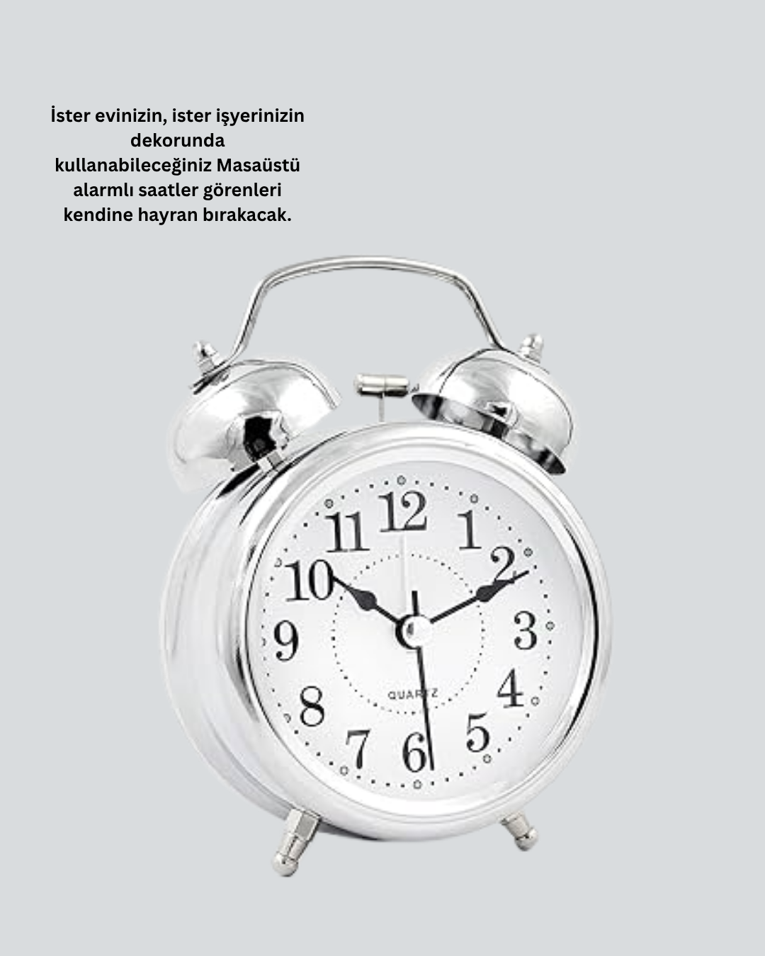 Evinizde veya ofisinizde hem estetik hem fonksiyonel bir parça arıyorsanız, Dekoratif Gümüş Işıklı Masa Saati mükemmel bir tercihtir. Yuvarlak tasarımı, sade ama zarif bir görünüm sunarken, güçlü alarm fonksiyonu ile uykusu ağır olan kullanıcıları bile rahatlıkla uyandırır.Sessiz çalışan mekanizması, gece boyunca rahatsız edici sesleri ortadan kaldırır. Işıklı ekran özelliği sayesinde karanlık ortamlarda bile zamanı rahatça görebilirsiniz. 12 x 9 x 5 cm boyutları, kompakt yapısı ile her yüzeyde kolay kullanım sağlar.Metal ve plastik kombinasyonu gövdesi dayanıklı ve uzun ömürlüdür. 1 adet AA pil ile çalışır (pil dahil değildir).Bu masa saati yalnızca zamanı göstermekle kalmaz, aynı zamanda bulunduğu ortama zarif bir dekoratif hava katar. Ev, yatak odası, ofis veya hediye olarak her ortamda fark yaratır.
