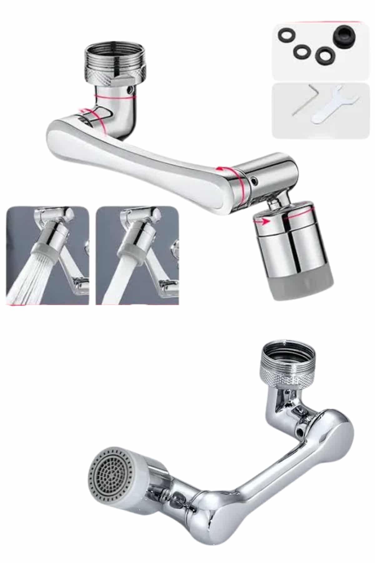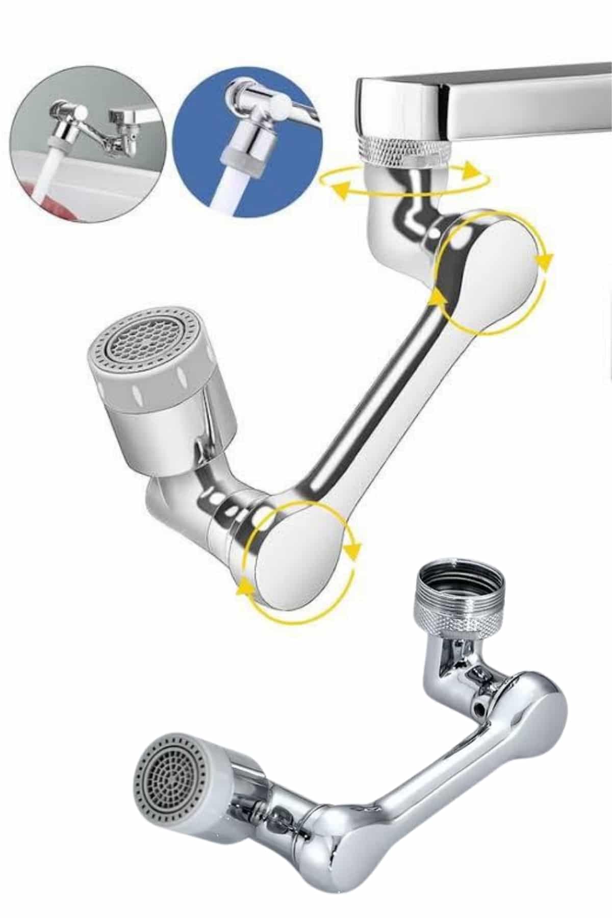 1080° dönebilen musluk başlığı, lavabonuzda çok yönlü kullanım avantajı sağlayan fonksiyonel bir tasarıma sahiptir. Standart musluklara göre çok daha geniş hareket kabiliyeti sunan bu ürün, suyu tam istediğiniz noktaya yönlendirerek günlük temizlik işlerini ve kişisel bakım rutininizi kolaylaştırır.Tam 1080 derece dönebilmesi, musluk başlığını hem yukarı hem aşağı, hem sağ hem sol tarafa yönlendirebilmenize imkan tanır. Böylece yüzünüzü, saçlarınızı, ellerinizi yıkarken veya gargara yaparken suyu daha kontrollü bir şekilde kullanabilirsiniz. Özellikle sabit musluklardan kaynaklanan su sıçraması problemi bu ürünle büyük ölçüde ortadan kalkar.Musluk başlığı, iki farklı su akış modu sunar: püskürtme modu ve köpük akış modu. Köpük akış modu, daha yumuşak bir su deneyimi sunarak hassas kullanım gerektiren yüz yıkama ve kişisel temizlik işlerinde ideal bir çözümdür. Püskürtme modu ise geniş açılı güçlü bir akış sağlayarak lavabonun her noktasına erişir ve temizlik işlemlerini çok daha hızlı hale getirir.Üründeki dört katmanlı filtre sistemi suyun içerisindeki tortu ve kirleri tutmaya yardımcı olur. Aynı zamanda suyun daha düzenli akmasını sağlar. Sızdırmazlık sağlayan çift conta yapısı, musluk başlığının güvenli ve damlamadan kullanımını destekler.Montaj süreci oldukça basit olup ekstra bir uzmana ihtiyaç duyulmaz. 20–24 mm arası dış dişli musluklara doğrudan takılabilen yapısı ile çoğu ev musluğuna uyum sağlar. Paket içerisinde yer alan alyan anahtarı ve contalar, kurulumu daha sağlam ve pratik hale getirir.1080° hareket özelliği sayesinde lavaboda suyun yönünü ayarlamak çok kolaydır. Bu özellik, hem temizlik işlerinde zaman kazandırır hem de suyun gereksiz yere dağılmasını engelleyerek su tasarrufu sağlar.Mutfağınızda, banyonuzda veya lavabo alanında pratiklik ve konfor arıyorsanız, bu döner musluk başlığı yaşam kalitenizi yükseltecek fonksiyonel bir çözümdür.