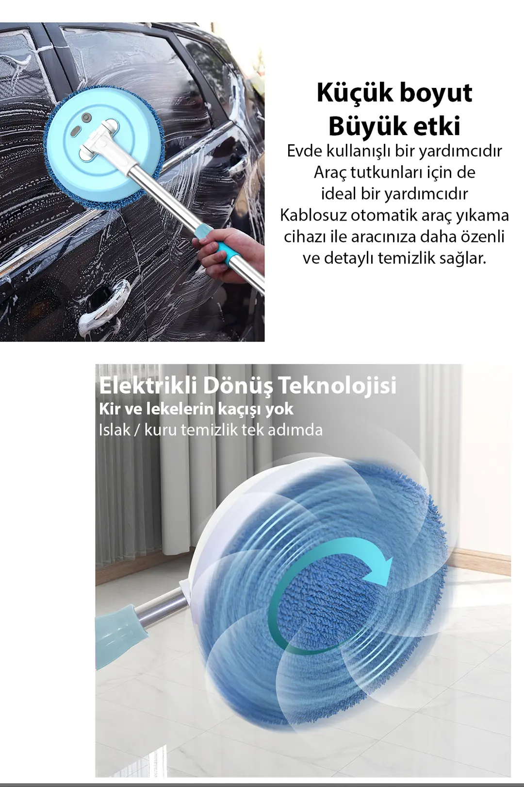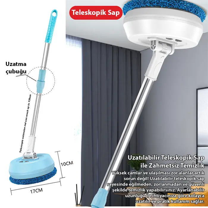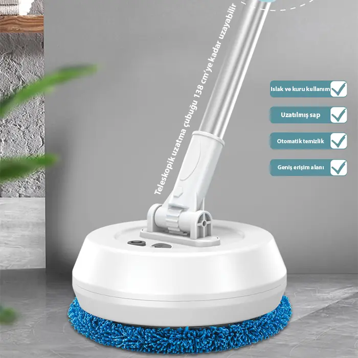 Elektrikli döner başlığı sayesinde kir ve lekeleri kolayca temizler. Islak ve kuru kullanım özelliği ile çok yönlü temizlik sağlar.