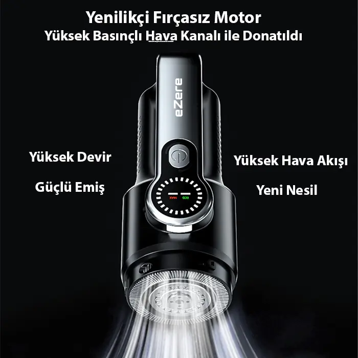 eZere PowerVac1, 20.000 Pa güçlü emiş gücü, turbo tip fırçasız motoru ve çoklu başlık sistemi sayesinde araç içi, ev ve dar alan temizliğinde maksimum performans sunar.