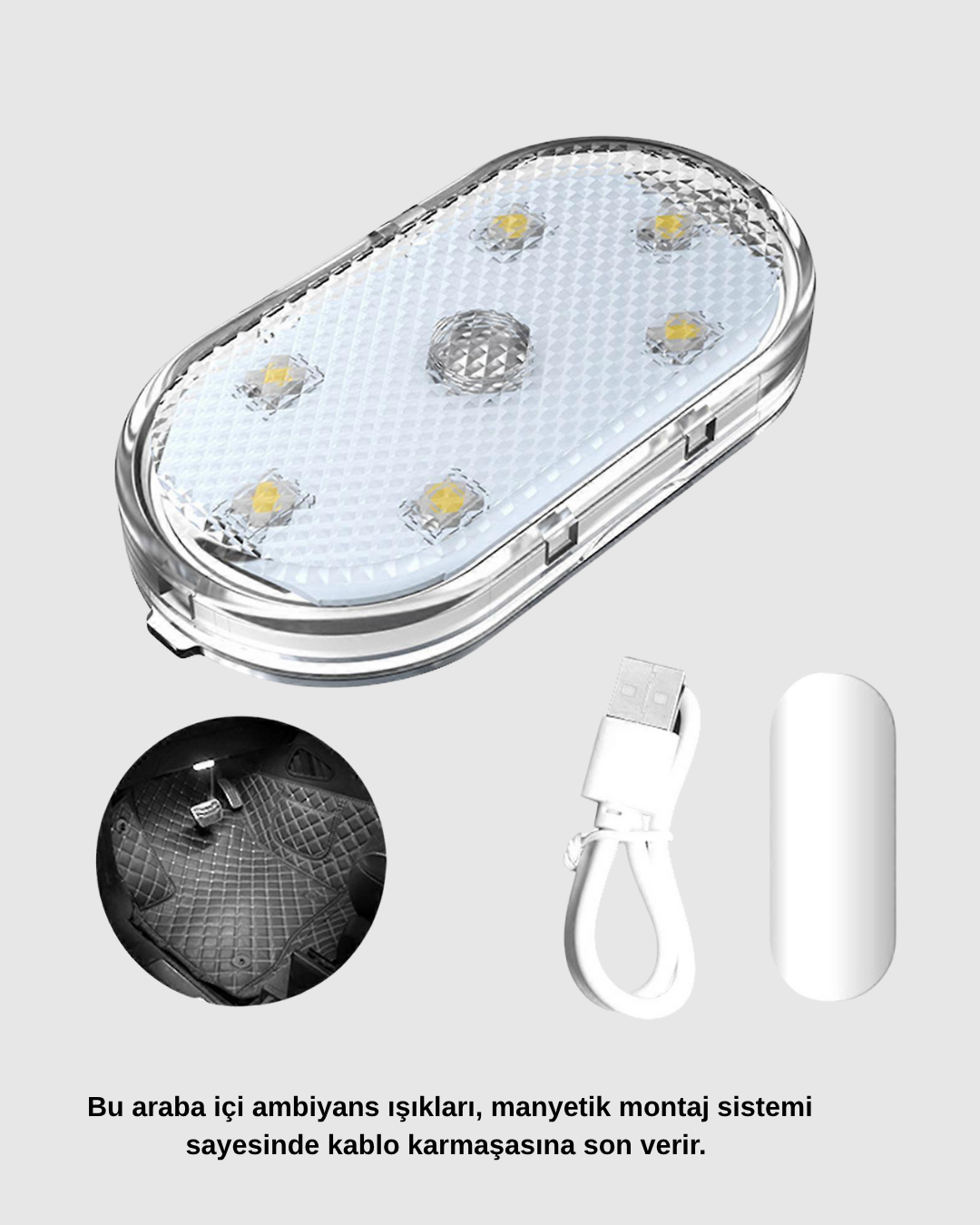 Aracınızın iç mekanına modern bir dokunuş katmak istiyorsanız, bu manyetik montajlı ambiyans ışıkları tam size göre! Kablo karmaşasını ortadan kaldıran yenilikçi tasarımı sayesinde karmaşık kurulumlara gerek kalmaz. Manyetik yapısı, ışıkları istediğiniz yüzeye kolayca takıp çıkarmanızı sağlar.Kablosuz yapısı, hem pratik hem de estetik bir kullanım sunar. Montajı sadece birkaç saniye sürer; aracın kapı altı, torpido veya koltuk altı gibi bölgelerine kolayca yerleştirilebilir. Bu sayede sürüş deneyiminiz sadece konforlu değil, aynı zamanda görsel olarak da etkileyici hale gelir.Yumuşak aydınlatma efekti, gece sürüşlerinde göz yormadan hoş bir ambiyans yaratır. Minimalist tasarımıyla aracınıza modern bir görünüm kazandırırken, enerji tasarruflu yapısıyla uzun ömürlü kullanım sağlar.Şık ve düzenli bir iç mekan isteyen sürücüler için mükemmel bir çözümdür.