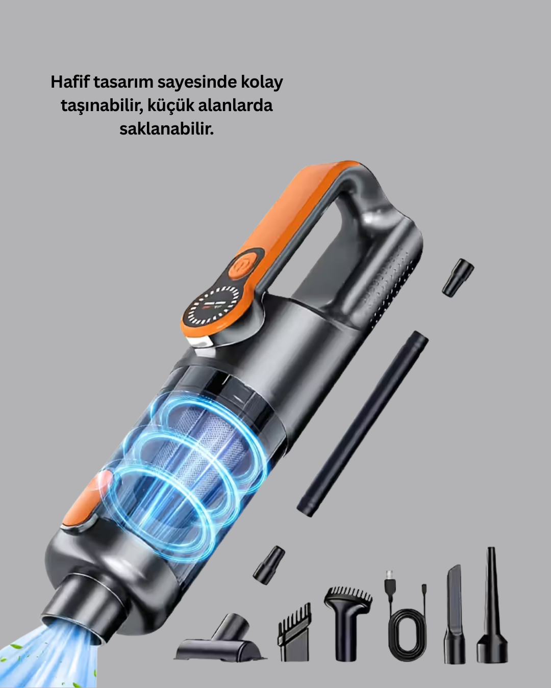 Bu şarjlı kablosuz el süpürgesi, güçlü emiş performansı sayesinde toz, kırıntı, saç, kum ve sıvı kalıntılarını saniyeler içinde temizler. Kompakt yapısı ve hafif tasarımıyla hem evde hem araç içinde hızlı temizlik için ideal bir çözümdür. Ürünle birlikte gönderilen numaratör hediyesi, özellikle paketleme, düzenleme ve işaretleme işlemlerinde ekstra kolaylık sağlayarak kullanım deneyimini daha da zenginleştirir.USB Type-C ile kolayca şarj edilebilen cihaz, tam şarjla 25–30 dakika kesintisiz çalışma süresi sunar. Kablosuz yapısı sayesinde kablo derdi olmadan merdiven, koltuk arası, yatak altı ve araç kapı cepleri gibi dar alanlarda rahatça kullanılabilir.Set içerisinde bulunan 5 farklı başlık aparatı, ürünü çok yönlü bir temizlik cihazına dönüştürür. Dar uçlu başlık ince bölgelerde detaylı temizlik sağlarken, geniş başlık büyük yüzeylerde etkilidir. Fırçalı başlık hassas yüzeyler için idealdir; yuvarlak başlık köşelerde maksimum verim sunar. Esnek hortum ise en zor ulaşılan alanlara erişim sağlar.Sökülebilir ve yıkanabilir toz haznesi hijyenik kullanım imkânı sunar. Gürültü seviyesi düşük olduğu için ofis, ev ve araç ortamlarında rahatsız etmeden kullanılabilir. Hem pratik temizlik ihtiyacı olanlar hem de günlük hızlı kullanım arayanlar için güçlü, taşınabilir ve çok yönlü bir temizlik çözümüdür.