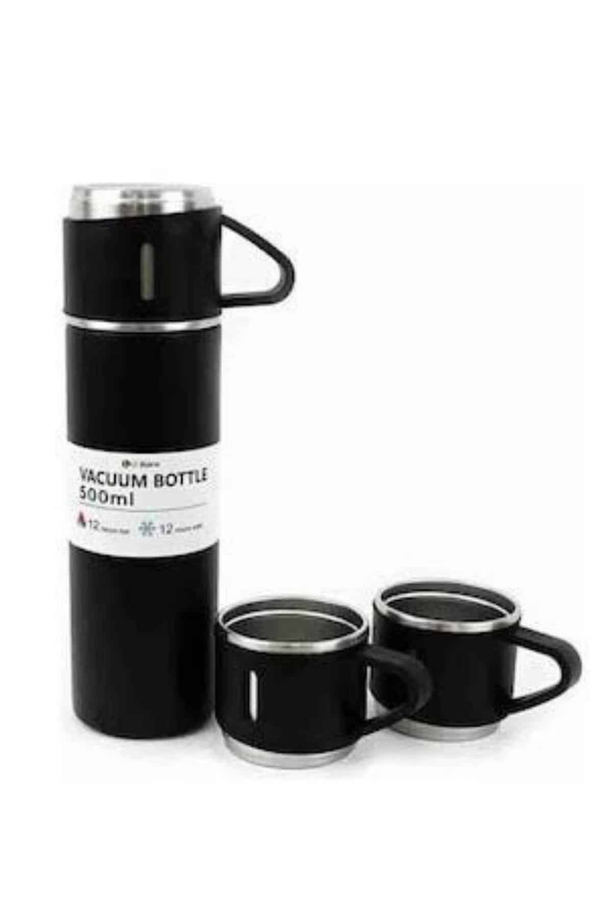 • Termos Paslanmaz Çelik Termos Siyah Renk 3 Bardaklı Termos Seti