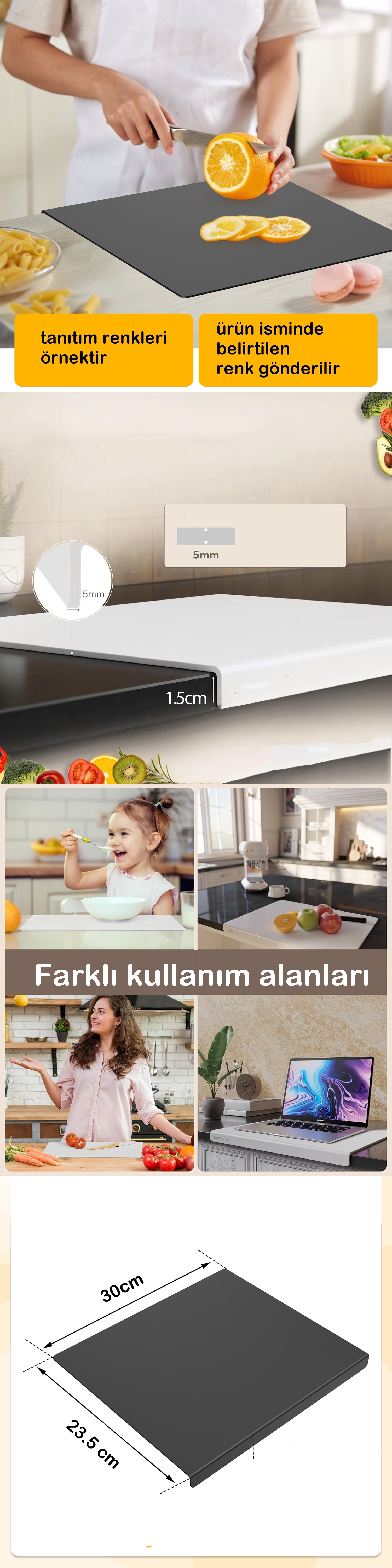 Benzersiz Tezgah Köşesine uyumluluk: L Tasarımı bu akrilik kesme tahtası, yenilikçi 1.5 cm lik tezgah dudak tasarımıyla öne çıkıyor. Bu özellik çekmecelere kolay erişim sağlayarak onu mutfak koleksiyonunuz için plastik kesme tahtalarınıza kullanışlı bir ek haline getiriyor.